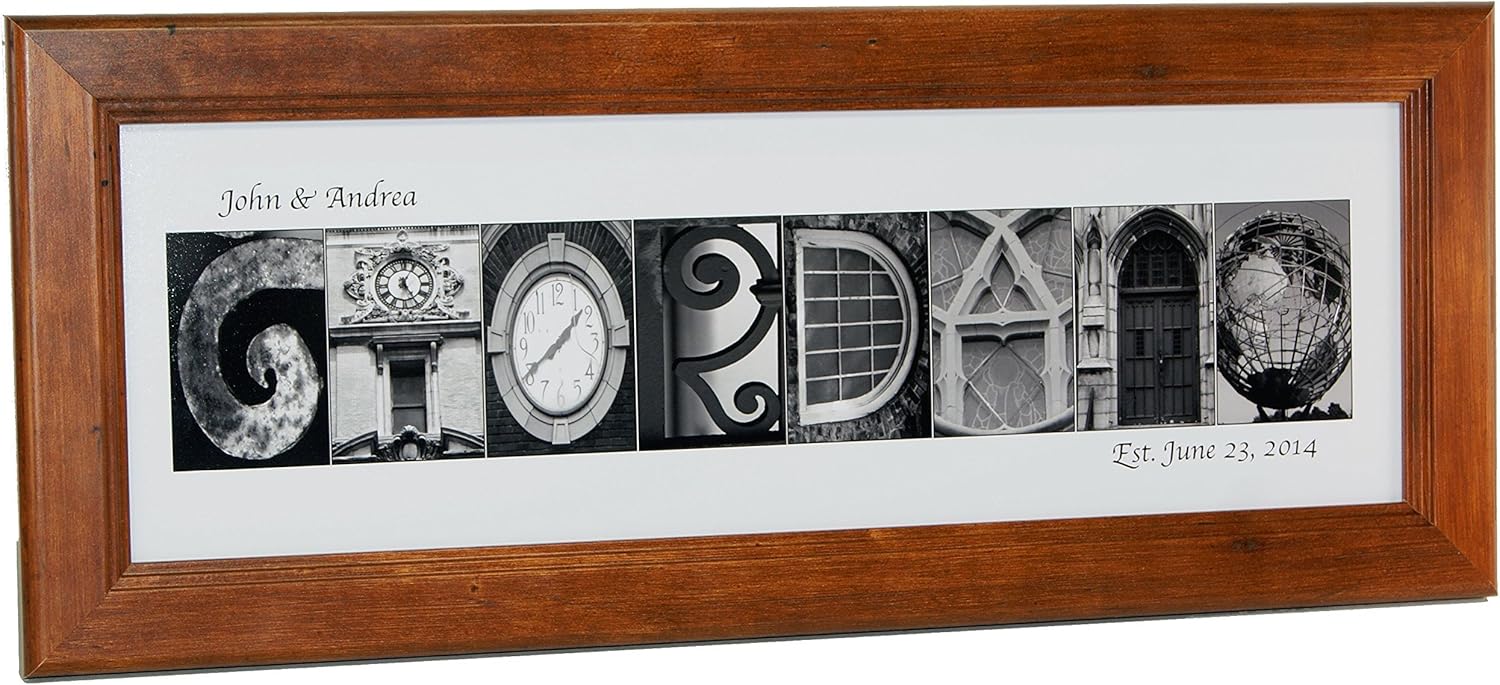 The Perfect Personalized Wedding Gift. Choose a theme that best describes this new couple. All Photgraphs that make up a Creative Letter Art? are Unique, Original and One-Of-A-Kind. Each one has a unique and different description bringing every word and each name to life. Choose a unique Theme that best describe the Name, Person or Word your spelling and leave the rest to us. We will create it using the most pronounced images along with amplifying them with the perfect balance of textures and/or colors. Your new Art includes our exclusive Self Standing Frame and Photograph Print. We include a Signed and Dated Certificate with appropriate hardware making it ready to Hang as well for versatility. See for yourself why Creative Letter Art? stands alone. Be sure to visit our interactive website at Creativeletterart.net to create. We can be reached at ethan@creativeletterart.net or by phone 800-610-4180 - Thank You for Looking.