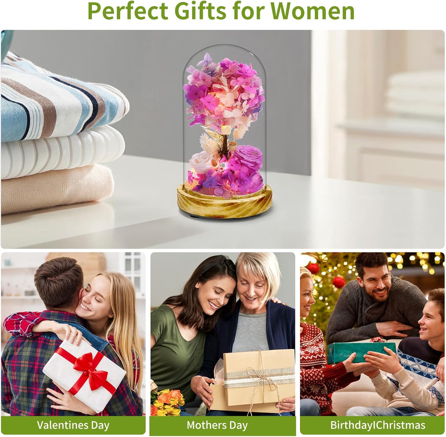 | Material Type | Glass, Led Lights, Preserved Flowers, Wood |